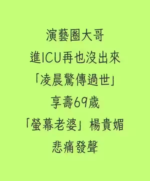 快訊/演藝圈大哥進ICU再也沒出來「凌晨驚傳過世」享壽69歲「螢幕老婆」楊貴媚悲痛發聲