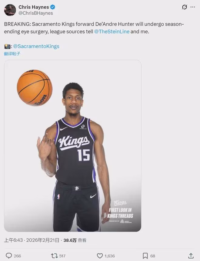 2月21日上午,據NBA名記Chris Haynes報道,國王前鋒德安德烈-亨特接受眼部手術,本賽季報銷!最近三天,國王已經有三名主力賽季報銷:小薩博尼斯接受左膝半月板撕裂修復手術;拉文接受右手無名指肌腱修復手術。