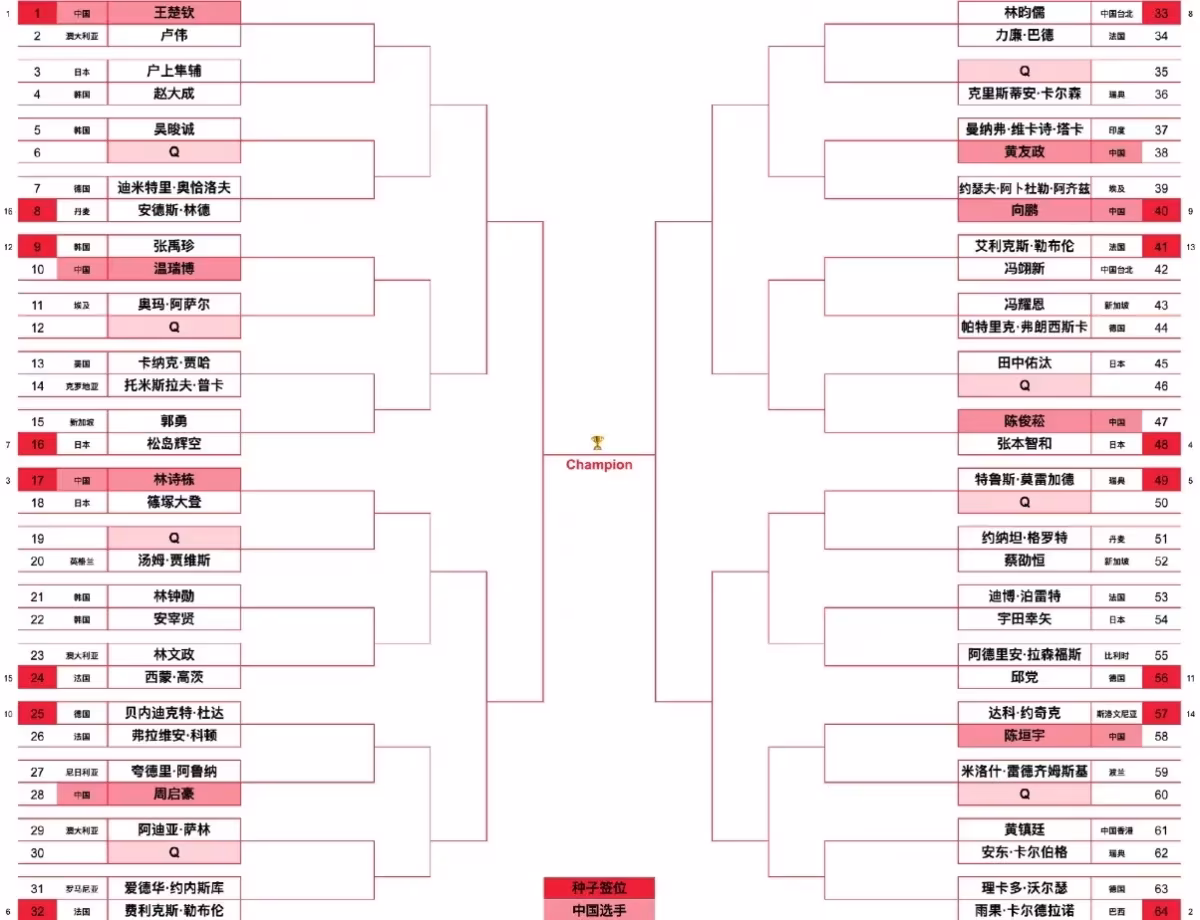 在正賽簽表上,頭號種子是王楚欽,第一輪比賽對手是澳大利亞的盧偉,相信不難拿下。