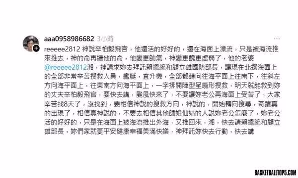 近日,一名自稱神職人員的網友施昆池在社群媒體發文,並標註辛柏毅飛官的妻子,宣稱辛員「仍在海面漂流」,並表示「神指示」搜救應往特定方向調整。