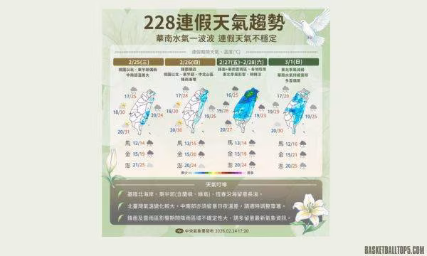 最令人遺憾的是,周五與周六(2月27日至28日)正好是連假核心關鍵,卻遇上鋒面通過及東北季風再增強,加上華南雲雨區接續東移。氣象署臉書粉專「報天氣」特別提醒,這兩天「各地雲多易雨,天氣極度不穩定」,原本計劃好的郊遊、露營或戶外活動,極大機率會被這場雨打亂。