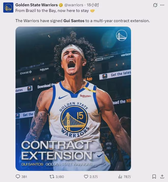 勇士官方宣布:正式跟吉-桑托斯(Gui Santos)完成續約,雙方簽下多年合同。另據NBA名記Shams報道,這份合同是3年1500萬美元。桑托斯原有的合同3年514萬美元,2023年簽約,2026年夏天到期,本賽季薪水222萬美元。