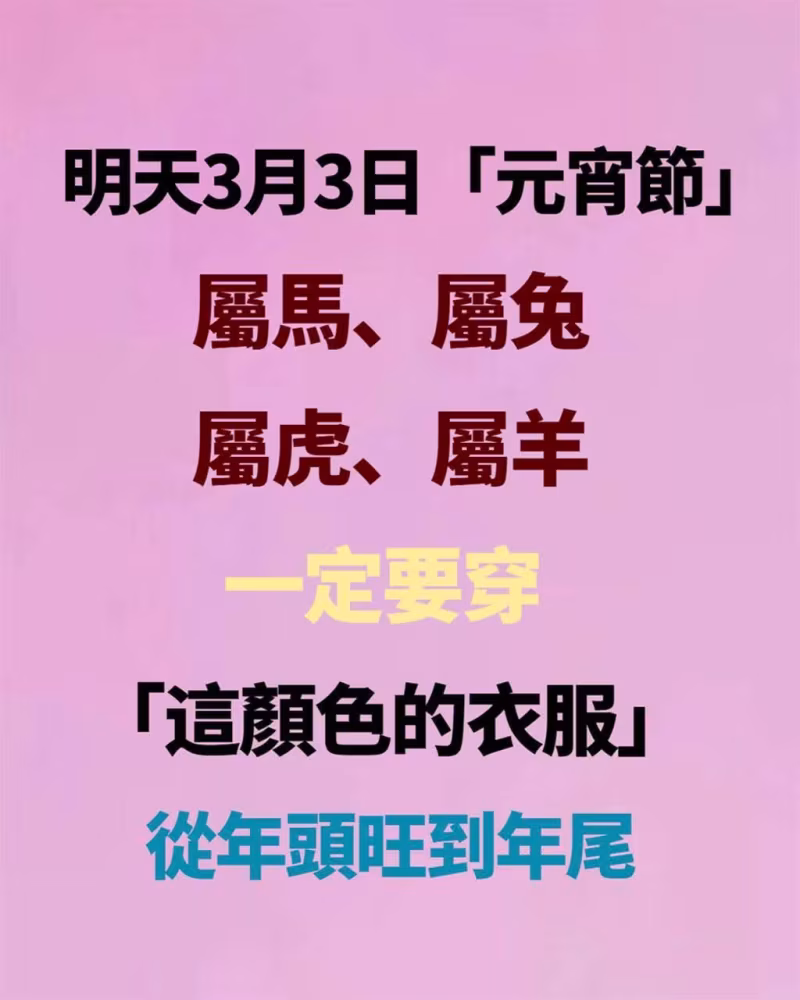 次吉色:黑色、深藍色水雖克火,但適度的「水克」可降溫去躁,尤其適合脾氣急、壓力大的屬馬人,有助於冷靜決策、避開口舌是非。避免:紅色、紫色、粉色等火系顏色當日火已被水壓制,再穿紅系等於「逆勢而行」,易導致精力耗損、做事不順,尤其不宜在南方活動時穿著。