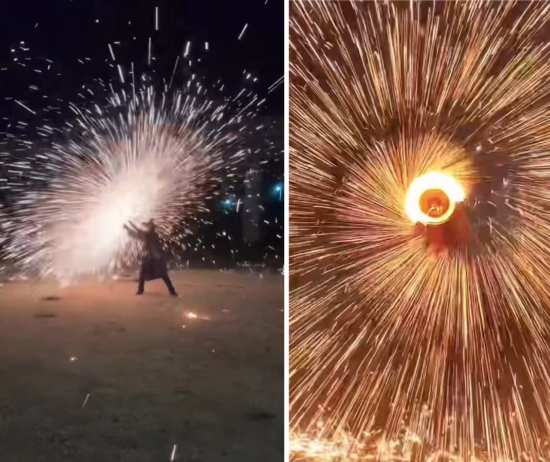 王先生指,「村夫」是兩個女兒的單親爸爸,為了生活,他搬過磚、送過外賣、做過代駕。7年前,在網上開了帳號做搞笑表演,看到打鐵花流量不錯,去年又自學了電鑽打火花和火壺表演。