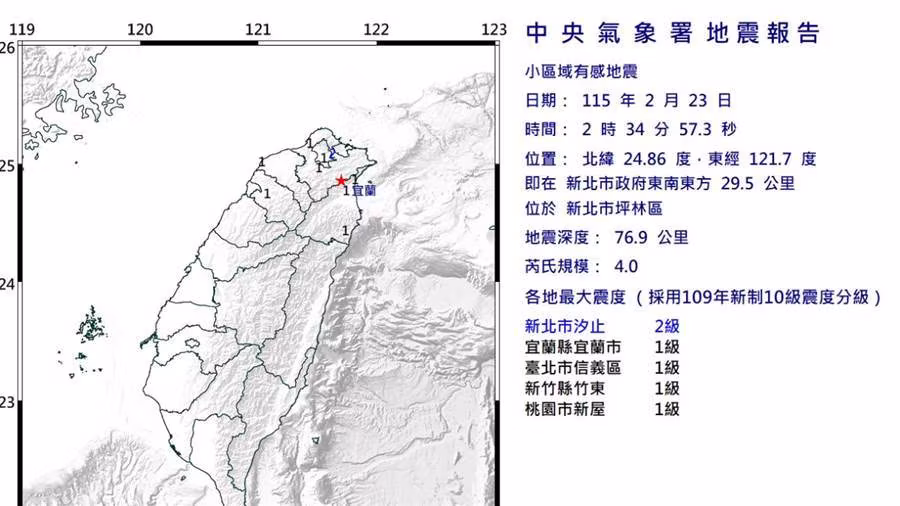 地牛翻身!台灣今(23)日凌晨2時34分,新北市坪林區發生規模4.0地震,地震深度76.9公里,震央位於新北市政府東南東方29.5公里,最大震度2級。