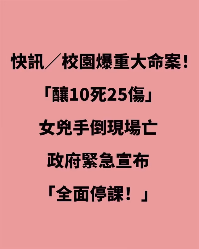 快訊/校園重大命案!「釀10死25傷」女兇手倒現場亡,政府緊急宣布「全面停課」