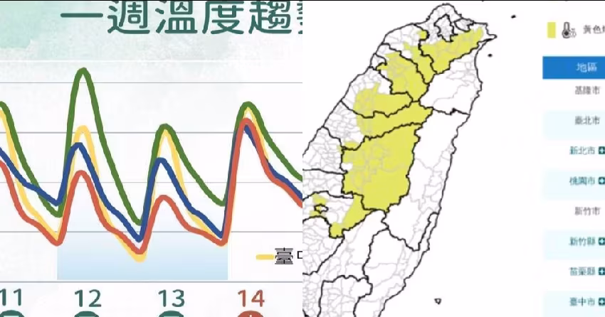 黃色「寒冷」低溫燈號示警範圍新北市、桃園市、新竹縣、苗栗縣、台中市、彰化縣、南投縣、嘉義市、嘉義縣、金門縣