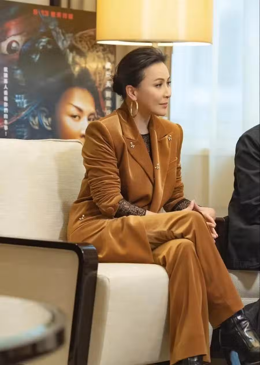★ 黃皮適合:淺牛仔藍色、淺米色、元氣橘、香檳色等。劉嘉玲的膚色就屬於黃調偏白的,她一身自帶貴氣的香檳色絲絨西裝套裝搭配金屬耳飾,襯托得皮膚光澤度很好,亮亮的。