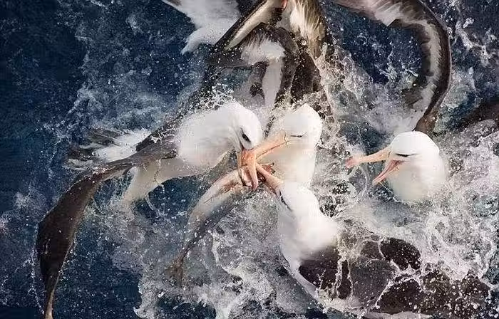 23.海鷗內卷,四隻海鷗爭奪一條魚。沒辦法,海鷗的捕魚能力一般,它們每天都吃不飽。