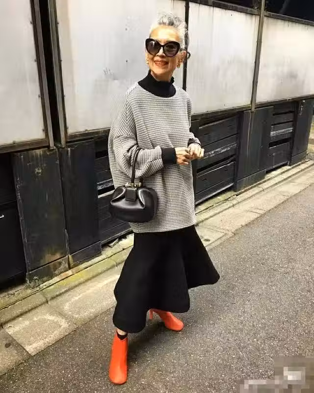 灰色套頭衫搭配黑色魚尾裙,內藤奶奶這套穿搭選用的是基礎款但比較有設計感的單品。中長的套頭衛衣慵懶又隨意,和半高領的黑色魚尾裙疊穿,時髦又顯俏皮,再利用一雙亮色系的鞋子做搭配,便綜合了冷色調帶來的嚴肅感,顯得俏皮時尚。