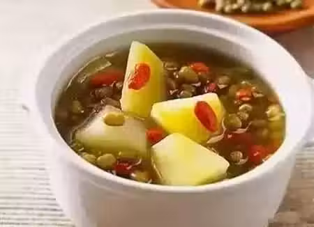 2、將綠豆以小火燉煮約40分鐘至軟化,加入木瓜、冰糖和枸杞,煮約5分鐘即可。