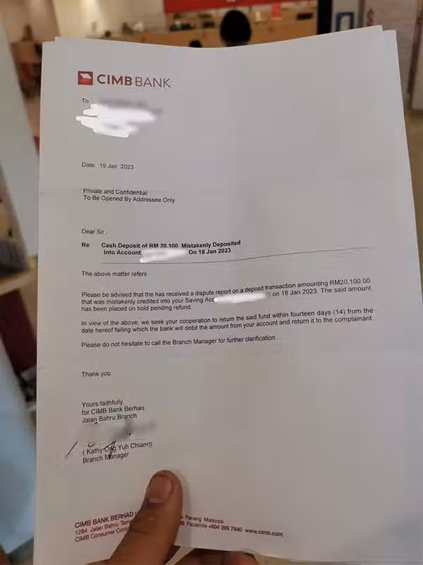 網民張貼領著信件到銀行辦理退還資金手續的照片。(取自面子書)
