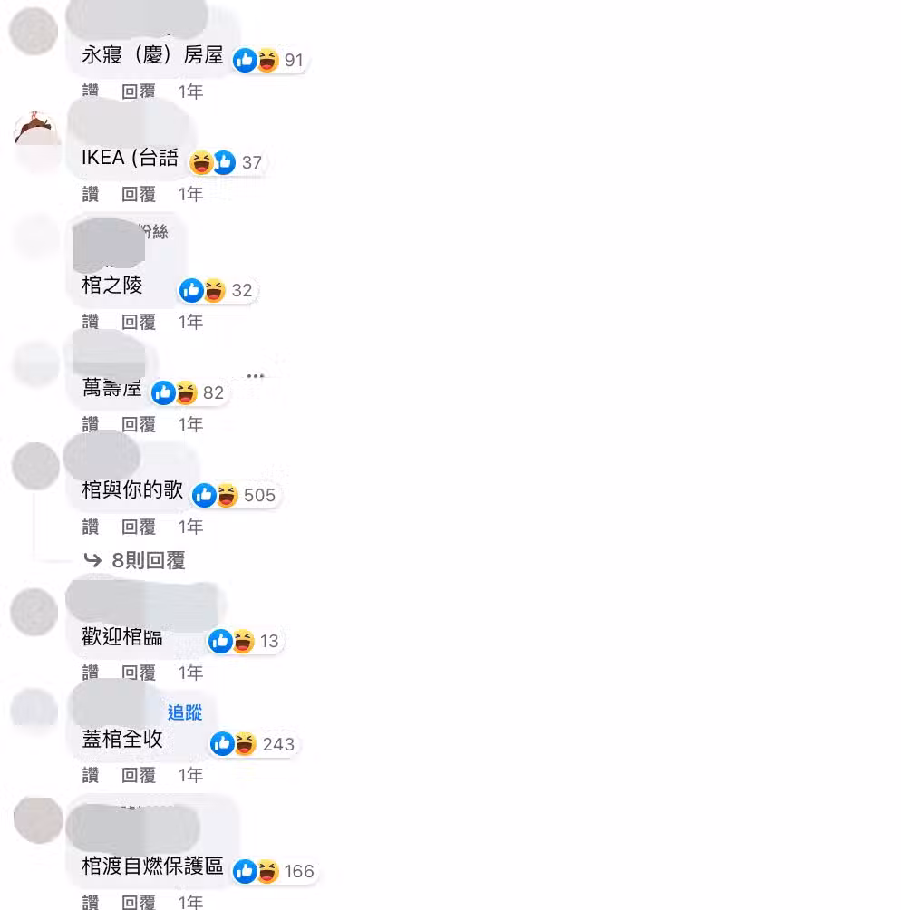 結果「棺我闢室」、「棺人我還要」、「蓋逝奇材」等店名獲得最多網友支持,其中「棺我闢室」竟然獲得4千多人支持,大家紛紛留言按讚響應,看了真的會一秒噴笑~
