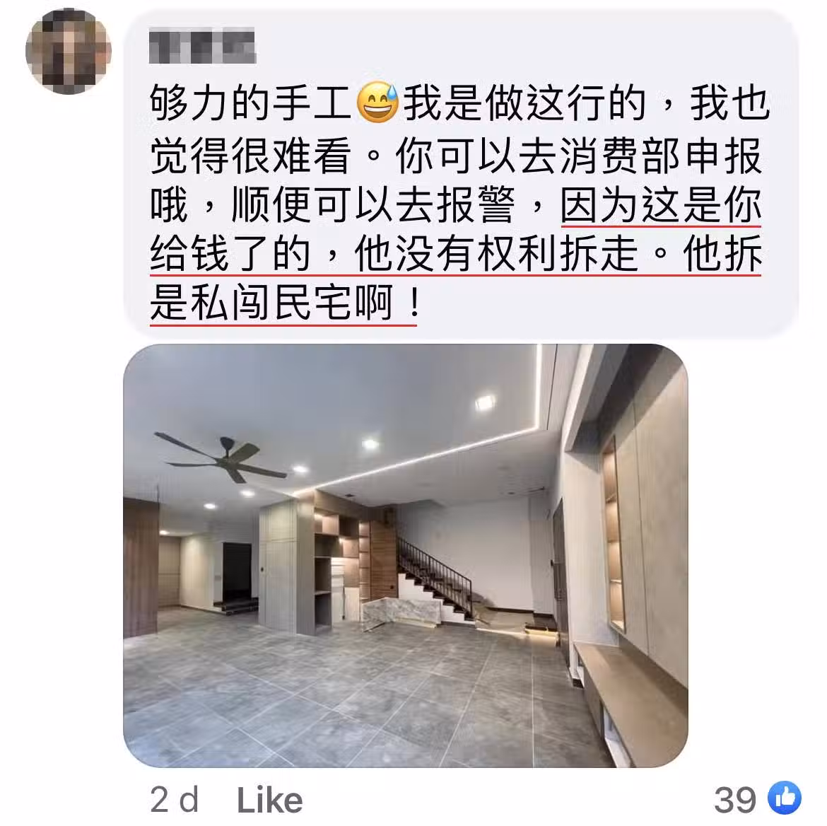 花RM188k裝修「手工慘不忍睹」原裝屋子毀了!還沒完工就催尾款「老闆wx要拆東西」!