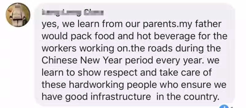 (網友B:是的,我們像我們的父母學習。每年春節期間,我爸爸會為工人打包食物和熱飲。因此我們學會尊重和照顧這些努力的人,是他們保障了我們國家有良好的基礎設施。) (網友C:我住的地方有一些外國客工,都會跟我打招呼,我也會笑著回應他,我真心尊重這些努力工作,幫助我們鄰里保持整潔衛生的人。) (網友D:真是個好爸爸!教育(思想灌輸)總是從父母開始。) (網友E:做得好。希望其他所有的爸爸都可以像他那樣對待客工,給予他們應得的尊嚴。) (網友F:這是我生日這天最好的一課,平等對待所有的人。) 還有的網友表示說:經常看到印度裔或孟加拉國的勞工在地鐵站上會主動起身讓座因為他們真是見多了歧視!不禁想起曾經看到過的 農民工大叔在地鐵上 有座位不敢坐的事件 怕身上的衣服弄髒座位 寧願在地上蹲著 局促不安的眼神令人心疼 老人看上去不再年輕 但此刻卻像孩子一樣無助