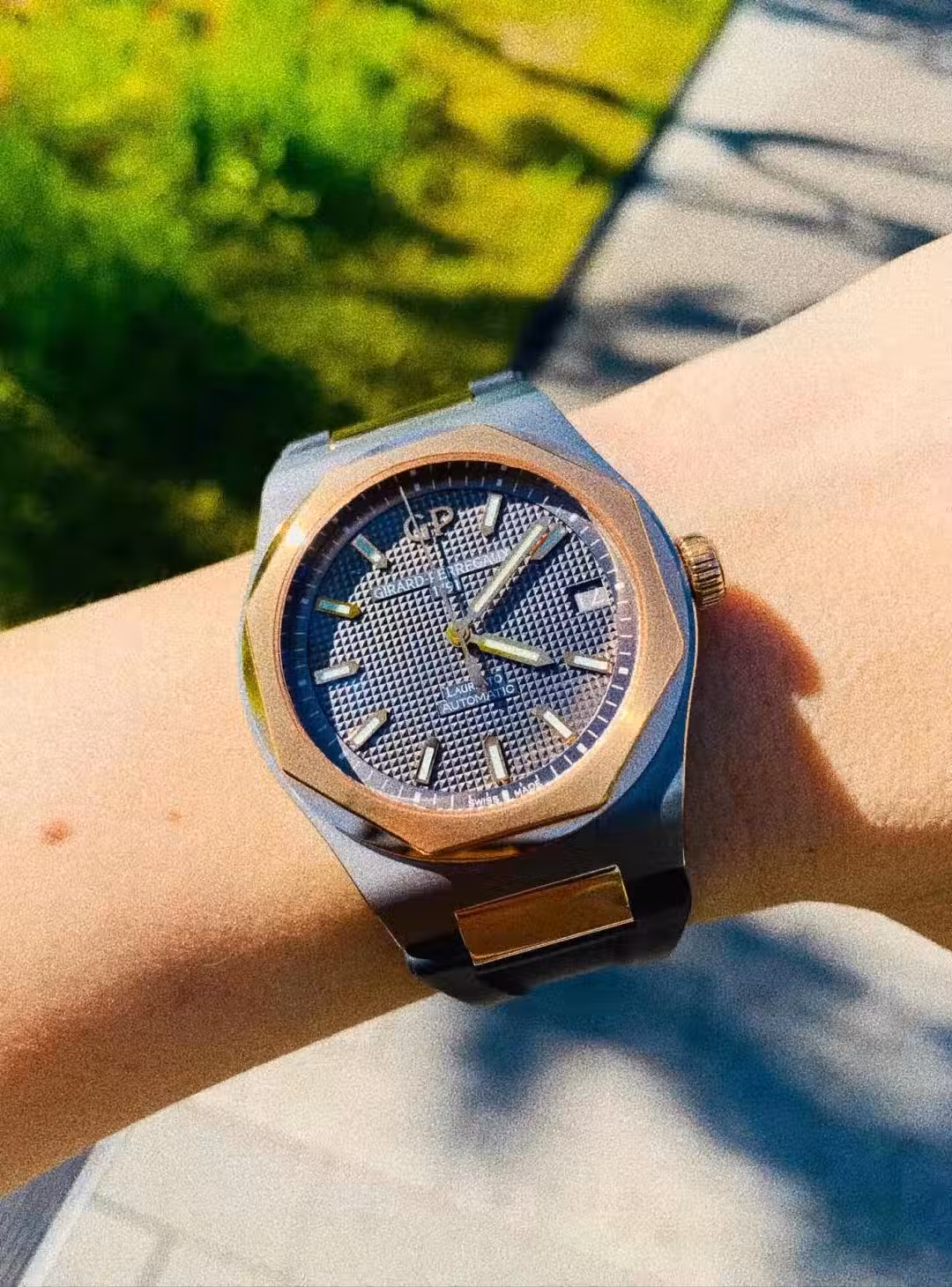 對於這枚桂冠的選擇我還是非常滿意的,此後對間金表款也不再排斥(當然還得看具體設計),怎麼形容呢?就好比有一位貌美佳人,單憑純素顏可能會覺得太過寡淡,而濃妝艷抹恐又顯得過於隆重,此時若是略施粉黛稍加修飾,那種比素顏精緻又比濃妝鬆弛的分寸感,不正是生活中最舒服的狀態嘛……這就是我對間金表的認知改變,它既不完全屬於純鋼款的進階、也不都是全金款的低配,它應該有屬於自己的存在意義,無論價值高低、性價比如何,設計優秀的間金表款都有其獨特的魅力,不應被一概低估或輕視!