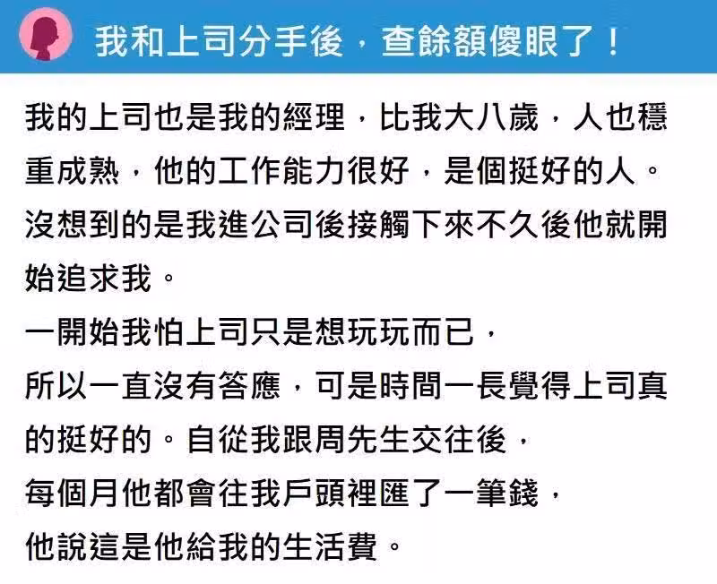 和大8歲上司交往,他每月給我生活費持續了1年多,直到分手後我一查餘額,當場傻眼了