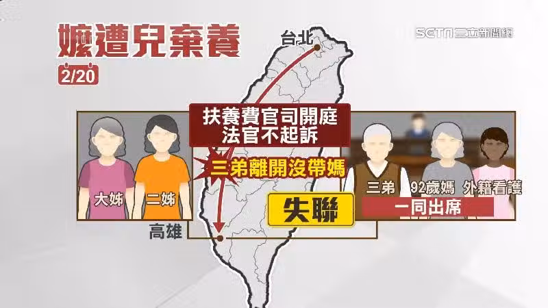 就在2月20日,大女兒三人接獲法院通知要開庭,當時92歲媽媽和三弟、外籍看護一同出席,沒想到到了法院後真相大逆轉,媽媽直接說「沒有要告子女」,眼看法官判決不起訴,三弟就提早一步離開法院,獨留92歲媽媽待在原地,隨後徹底消失無蹤...