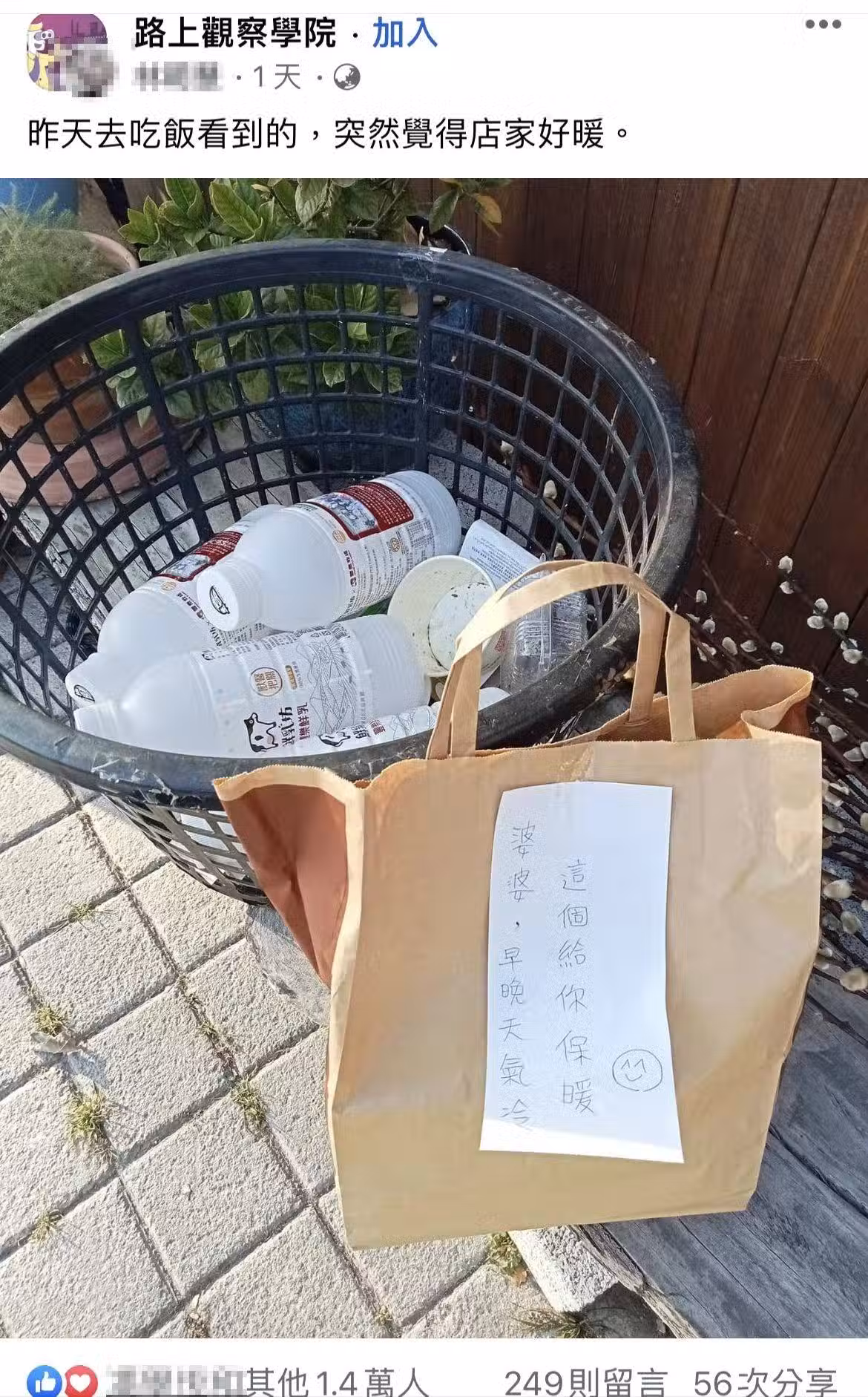 有網友在臉書群組推文,稱前幾天去台南市東豐路用餐吃飯,發現店裡整理了幾瓶空瓶給拾荒的婆婆,回收物的旁邊還放了一個紙袋子,上面寫著:「婆婆,早晚天氣冷,這個給你保暖」這位網友表示:「突然覺得這家店好溫馨。」
