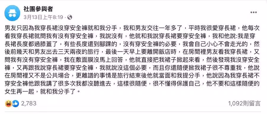 不爽女友穿長裙出去玩!男友「突然出手掀開檢查」 一看氣喊「不想跟隨便的女生在一起」秒提分手