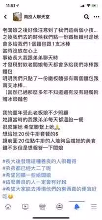 對此,戀恩表示,「我的童年受此老闆娘不少照顧,她讓當時的我跟弟弟每天都溫飽一餐,很感謝她希望聯繫上她。」並且強調,雖然自己能做的不多,但仍想拿出20份牛排套餐的費用,讓光顧老闆娘的前面20位客人能夠免費品嚐美食,就是為了表示感謝。