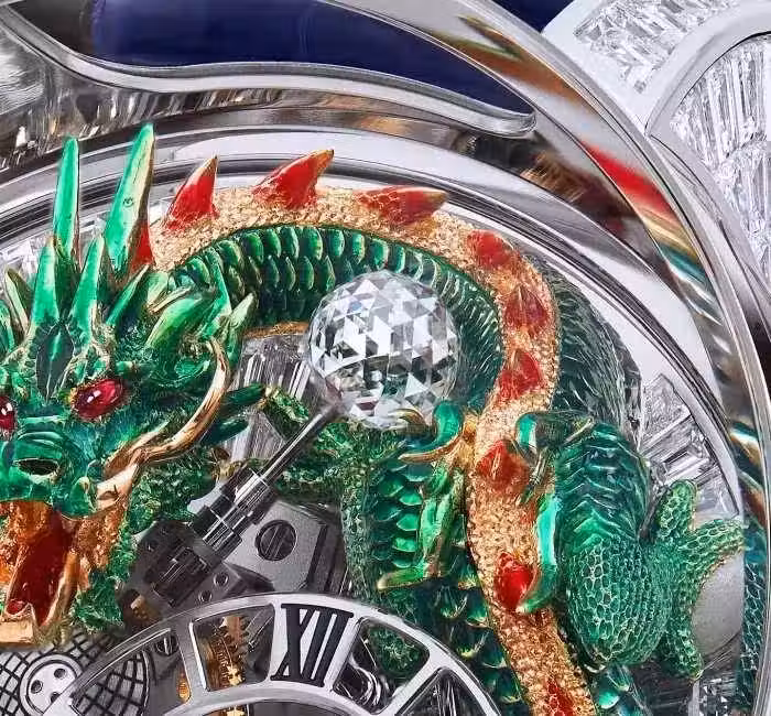 最後,雕塑被放置在機芯內,小心確保它不會妨礙手錶的完美運作。當龍抬起頭復活時,紅寶石般的眼睛和鮮紅的舌頭在燃燒。陀飛輪最初是為了提高懷表的計時性能而發明的。天文陀飛輪將這一具有200多年歷史的復雜功能帶到現代精緻和復雜性的驚人水平。
