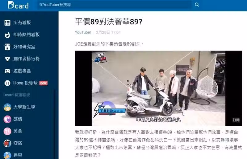 Joeman推出新影片,內容是「奢華89對決平價89」,而該片一出立刻引起正反討論,有網友在Dcard發文質疑說:「為什麼台灣就是有人喜歡去捧這些89,給他們流量幫他們炫富,是嫌台灣的89還不夠囂張嗎?」等言論。