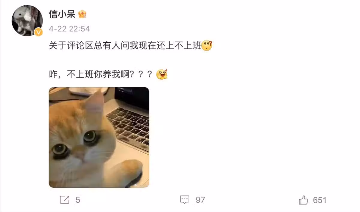 在另一條動態里,她抱怨通勤單程一個半小時還沒有座位的痛苦。