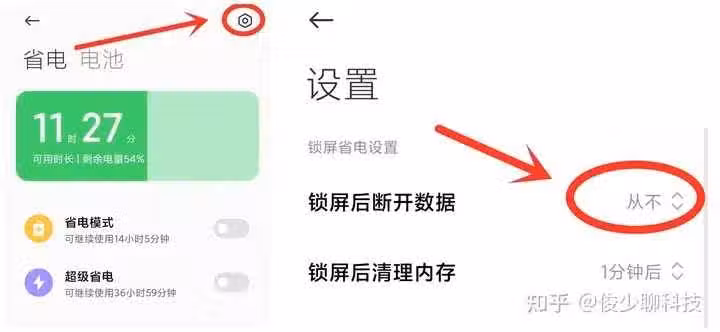 打開省電與電池之後,點擊右上角的齒輪圖標,進入設置頁面,在設置里邊直接把鎖屏後斷開數據連接設置為從不就可以了!