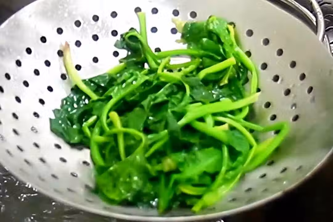2、鍋里燒水,加入一勺食鹽,一勺植物油,水開後倒入菠菜,焯水40秒去除草酸,然後撈出、用水沖洗沖涼。