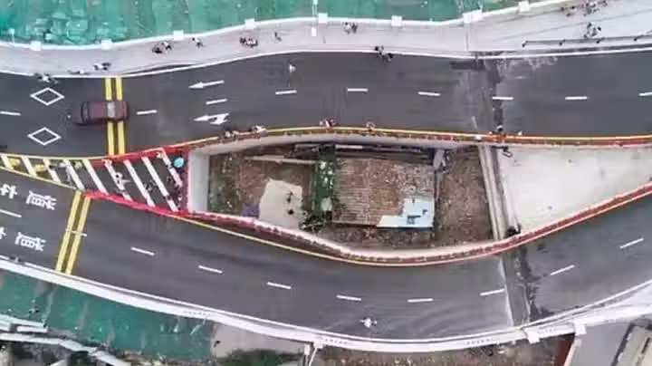 這棟位於中國廣東、被車道圍繞的平房,雖然大約僅有430平方英尺,但因為當初沒有和建商達成協議、屋主說什麼都不願意搬走,因此最後建商在規劃整個高速高路的設計時,只好退而求其次地在橋中央留一個坑,好在順利興建大眾運輸建設的同時,依舊該住戶得以繼續生活在原本最熟悉的地方。