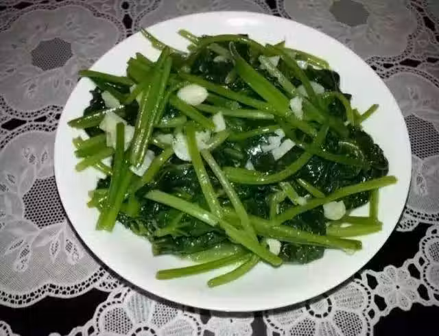 將嫩地瓜葉洗淨,放入沸水鍋中川燙後撈出,放涼切成段。大蒜剝皮切成碎末。炒鍋置火上,放油燒至四成熱,放人大蒜末炒出香味,加入地瓜葉翻炒,加入鹽巴、米酒炒入味,加入麻油調味,撒上剩餘的蒜茸拌勻即成。