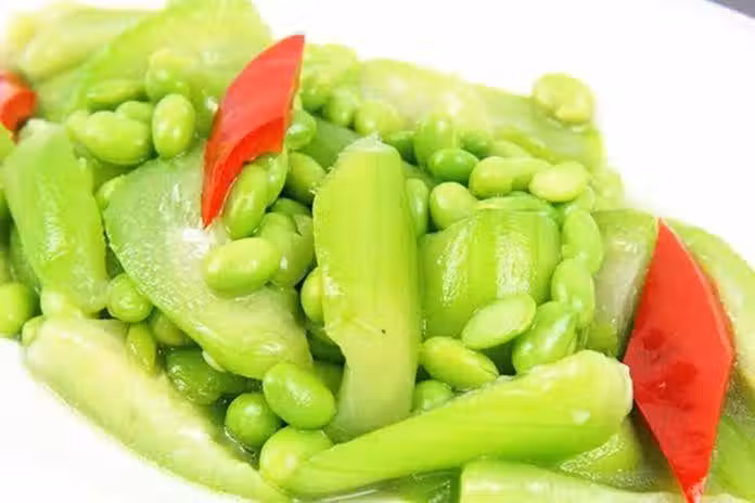 2.準備新鮮的毛豆籽100克,放入鍋中煮5分鐘,煮熟以後撈出來,沖洗過涼;再切點紅椒片搭配顏色。