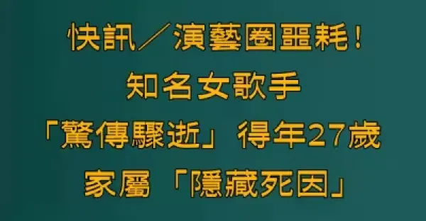 快訊/演藝圈噩耗!知名女歌手「驚傳驟逝」得年27歲,家屬「隱藏死因」!