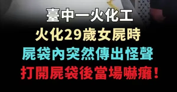 台中一火化工火化29歲女屍時, 屍袋內突然傳出怪聲, 他開啟屍袋當場癱坐在地
