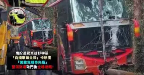 南投遊覽車往杉林溪「自撞車頭全毀」卡懸崖「駕駛竟離奇失蹤」警消到場破門後全場傻眼!