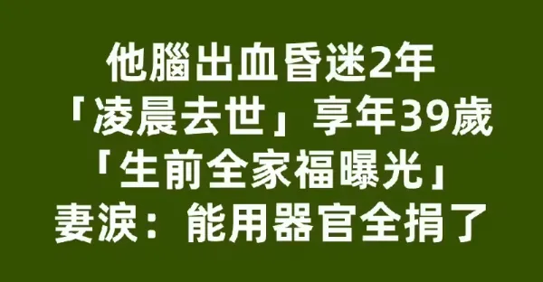 他腦出血昏迷2年「凌晨去世」享年39歲!「生前全家福曝光」妻淚: 能用器官全捐了!