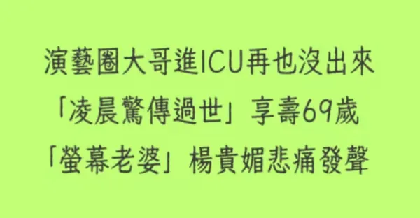 快訊/演藝圈大哥進ICU再也沒出來「凌晨驚傳過世」享壽69歲「螢幕老婆」楊貴媚悲痛發聲!
