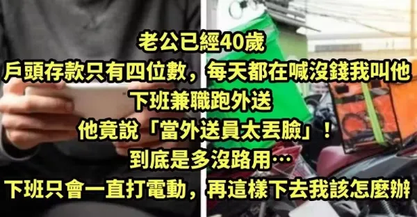 老公40歲了,戶頭存款只有四位數,每天都在喊沒錢,我叫他下班兼職跑外送,他竟說「當外送員太丟臉」!到底是多沒路用… 下班只會一直打電動,再這樣下去我該怎麼辦