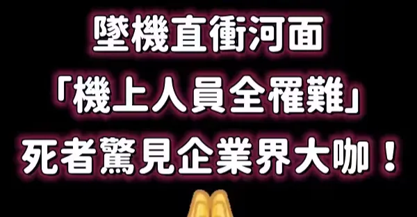 快訊/剛起飛15分鐘!墜機直衝河面「機上人員全罹難」… 死者驚見企業界大咖 !