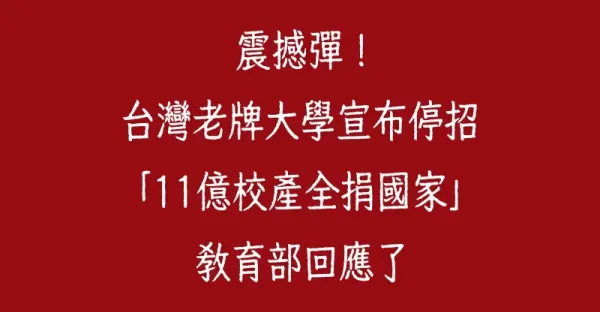 震撼彈!台灣老牌大學宣布停招「11億校產全捐國家」 教育部回應了