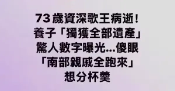 73歲資深歌王病逝!!養子「獨獲全部遺產」驚人數字曝光...傻眼「南部親戚全跑來」 想分杯羹