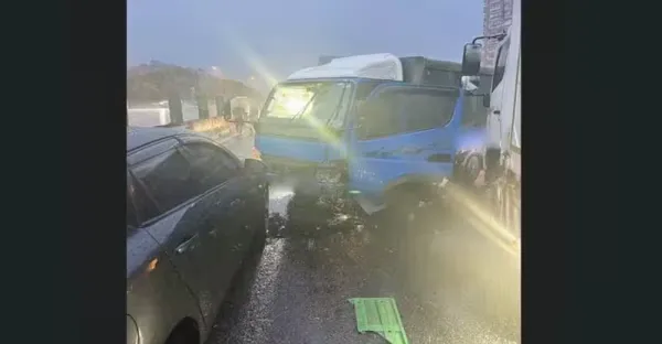 雨天路滑恐釀禍!貨車打滑「瞬間騰空」 女騎士慘遭波及