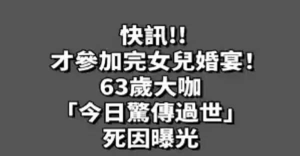 快訊/ 才參加完女兒婚宴!!! 63歲大咖「今日驚傳過世」 死因曝光