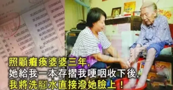 照顧癱瘓婆婆三年了,她給我一本存摺我哽咽收下後,我將洗腳水直接潑到她臉上!