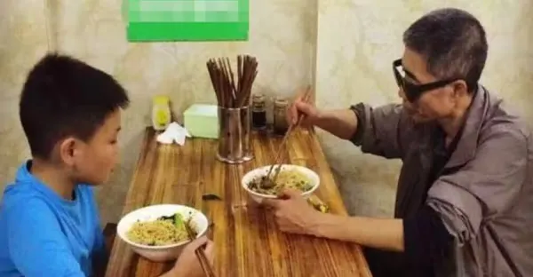 小男孩帶失明父進麵館,點餐大喊「大喊2碗、卻偷偷比1」老闆秒懂,父子離開後,留下的東西讓老闆淚目