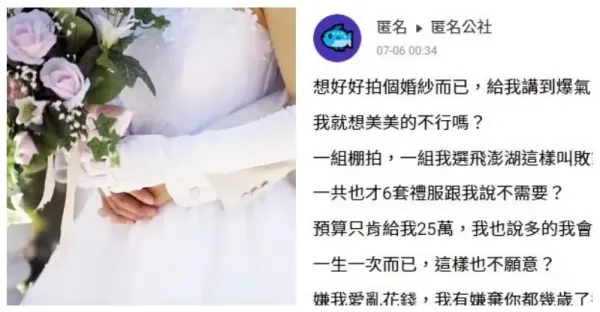 想好好拍個婚紗,給我講到爆氣!一組棚拍、一組飛澎湖,這樣叫敗家?一共6套禮服,預算只給我25萬,我說多的我出,未婚夫卻嫌我亂花錢,交往兩年短短七天看清了他的真面目... #網友全不挺