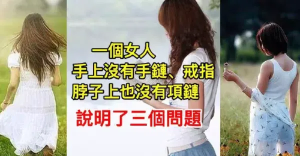 一個女人手上沒有手鍊、戒指,脖子上也沒有項鍊,說明了三個問題