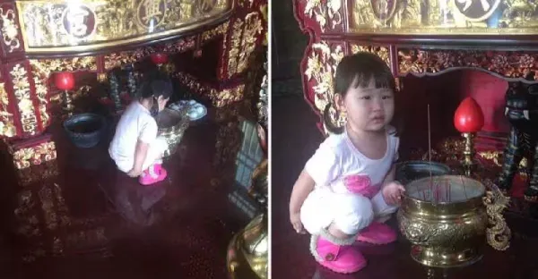 拜虎爺突然蹲下!!! 3歲女兒「用手扶著金爐」五官全皺成團 媽媽看清後「秒腿軟下跪」:不知者無罪