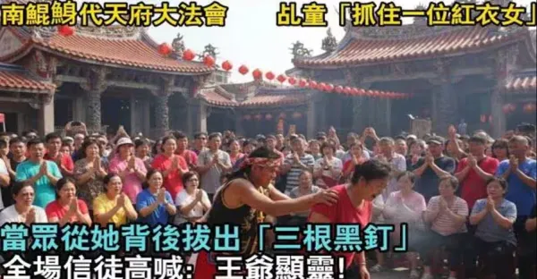 南鯤鯓代天府大法會,乩童突然「抓住一位紅衣婦人」當眾從她背後拔出「三根黑釘」全場信徒高喊:王爺顯靈!